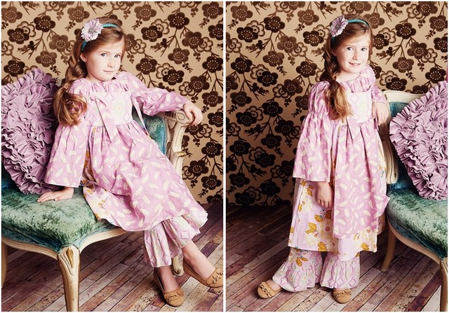 This collection includes a knot dress, peasant dress, peasant shirt, ruffle pants, twirl skirt, reverse knot apron top, ruffled socks, and two matching headbands. Whew!